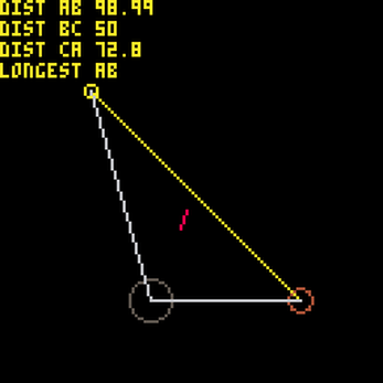 'Tri' was my attempt to create a triangle with movable points, with a lot of background stuff added that calculated the length of each side, as well as the longest side. You can cycle between the three points using the 'X' key (it cycles really fast though, watch out).